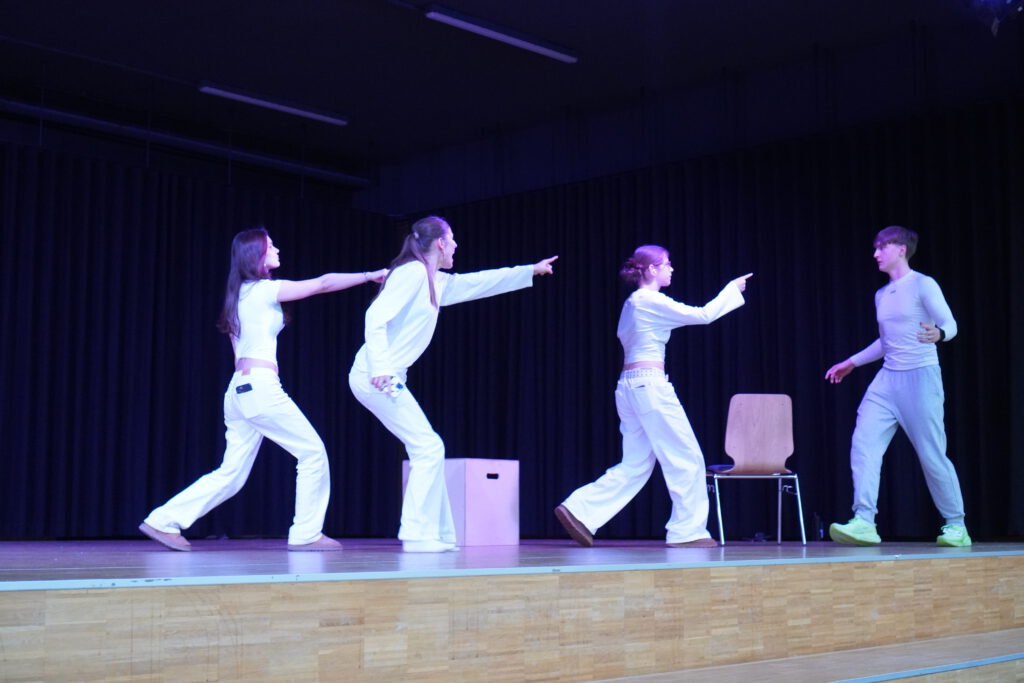 Sechs Schülerinnen und Schüler des 10. Jahrgang präsentierten ihr Theaterstück „Aber was jetzt“. Das selbst geschriebene Stück war ein echtes Highlight: Mit einer humorvollen, zugleich kritisch-reflektierten Sicht auf unseren Umgang mit Social Media traf es den Nerv der Zeit – pointiert, klug und absolut mitreißend! Die dramaturgische Umsetzung war stimmig und ideenreich, die Aufführung lebendig und voller Energie. Besonders die ausdrucksstarke Darstellung der sechs Akteure und ihre eindrucksvollen Monologe begeisterten das Publikum. Nach kurzweiligen 45 Minuten gab es den verdienten und langanhaltenden Applaus. Sichtlich stolz nahmen die sechs DarstellerInnen die positiven und überschwänglichen Rückmeldungen zu ihrem rundum gelungenen Auftritt entgegen – ein Theaterabend, der noch lange nachklingt! Wer sich nun ärgert, dieses Highlight verpasst zu haben, für den gibt es nun eine gute Nachricht – am 11. März wird es eine weitere (Zusatz)Aufführung geben. SAVE THE DATE!